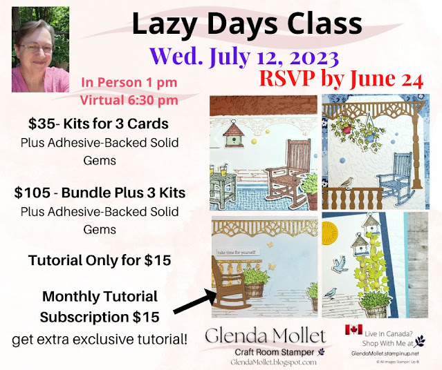 - Class Option 1: $35 Lazy Days Card Trio Kits plus Adhesive-Backed Solid Gems (only available in Canada)
